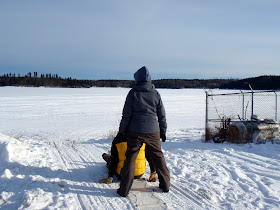 | Zoe & I about to ride the same sled on a MUCH smaller hill in Stanley Mission while we wait for the others to get the vehicles. |