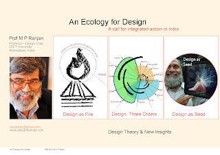 I was invited to a panel discussion at MICA, Ahmedabad (MUDRA Institute of Communication) as part of the National Seminar on Ecology, Communication and Youth: An ICZMP initiative at MICA campus, Shela, Ahmedabad from February 25 – 27, 2013 organised in partnership with, Gujarat Ecology Commission (GEC). The participants were NGO's and Field workers who are all youth from across the country, ecology and communication scientists and researchers and I was asked to speak in Hindi, which I did. The speakers at my session were scientists from ISRO, SAC and International expert in disaster management and the title of the session was Science and Arts for Managing Coastal Resources and as usual design was missing from the session title. My paper that I presented at the seminar is quoted below and the visual presentation can be downloaded from this link here as a pdf file. Download visual presentation here as a pdf file 3.8 mb Text file of my lecture is here as a pdf file 65 kb size I did not stick to the text submitted below but I did vent my thoughts on the disparity in funding and support from the Governemnt of India as well as the States for science and technology when compared to design although the premier Institute for design has now (finally) been accorded National recogntion by the Union Cabinet with the status of an Institute of National Importance. The scientists present at the seminar conferred with me and in response to my enquiery told me that the SAC gets about Rupees 600 crores a year and the parent organisation ISRO gets Rupees 6000 crores per year as their annual budget support for the year. Add to this the Rupees 5000 crores per year that is given to the CSIR and many hundreds of thousands more to defence and other sectors in the name of technology you will see that there is a complete absence of support for design in comparison. My stated position is that our country will not be able to solve its critical problems if this kind of disparity of funding continues in the future and I hope this message is heard and acted upon by the Finance Minister in his forthcoming budget or in a followup action when the matter of design as an activity of national importance is brought before the Indian Parliament, hopefully soon. An Ecology for Design: A call for integrated action in India M P Ranjan Professor – Design Chair, CEPT University Ahmedabad Presentation at National Seminar on Ecology, Communication and Youth at MICA, Ahmedabad on 26 February 2013 Preamble Quote from her “A Note from the Author” “As corporations, which play such a powerful determining role in our species’ behavior as a whole, understand and abide by the sustainable survival principles of living systems, their goals will come into harmony with our personal and community goals. We can then mature like other species from competition to cooperation and build a human society in which the goals of individual and community, of local and global economy, of economy and ecology are met. This will shift us out of crises and into the happier, healthier world of which we all dream. Let it be so!” Elisabet Sahtouris, September, 1999 as quoted in Elisabet Sahtouris and James E Lovelock, Earthdance: Living Systems in Evolution, iUniverse, 2000 (ISBN-13: 978-0595130672) This excellent book can be downloaded from her website here. or from a direct link as a pdf file here Earthdance.pdf 800kb Ecology and Design For me the seminar at MICA that will focus on the ecology of coastal Gujarat is an occasion to reflect on the terms – “Ecology” as well as “Design” – since both of these for me are central for understanding the world as a system and not as a collection of parts that we most times tend to do in order to achieve administrative convenience. The word Ecology is perhaps well understood by this gathering as the overarching processes of nature that includes the scientific study of the relationships that living organisms have with each other and with their natural environment. It alludes to the manner in which the various parts of the natural environment relate with each other and contributes to the sustainable survival or demise of the whole system. My definition of the word Design, however, may not be generally known nor accepted easily since we all carry so many versions for this particular word. So let me state it here in brief to explain my arguments further. Design is a cultural system just like literature, music, art and philosophy. Design is driven by human intentions and actions that shape our environment and over time it shapes us and the culture and values that we hold dear. It is not only informed by culture, but also helps create it and is one of the central contributors of both the tangible and intangible resources of any cultural entity through a constant process of evolution and assimilation that these living cultures tend to do. Design at a deep level deals with all aspects of human evolution and in the production of culture through the human use of local resources as well as the unfolding of human imagination and political action that brings change. Therefore this search is not just for truth that exists (which is what science does) but a search for what could be the imagined possibilities and options and these are preferably aligned with an existing trajectory of culture so that it is more acceptable to local inhabitants and the holders of that particular culture. Therefore, design imaginations offerings cannot be tested in a laboratory but can only be manifested in the world through its acceptance by the people who wish to own it and put it to use. They need to be prototyped and visualized at an early stage and then taken through many stages of refinement and testing before a wholesale adoption of the se offerings can be made practical and desirable. Design is also a profession and here our understanding of its knowledge, skills, sensibilities and its scope are all changing as we continue to g